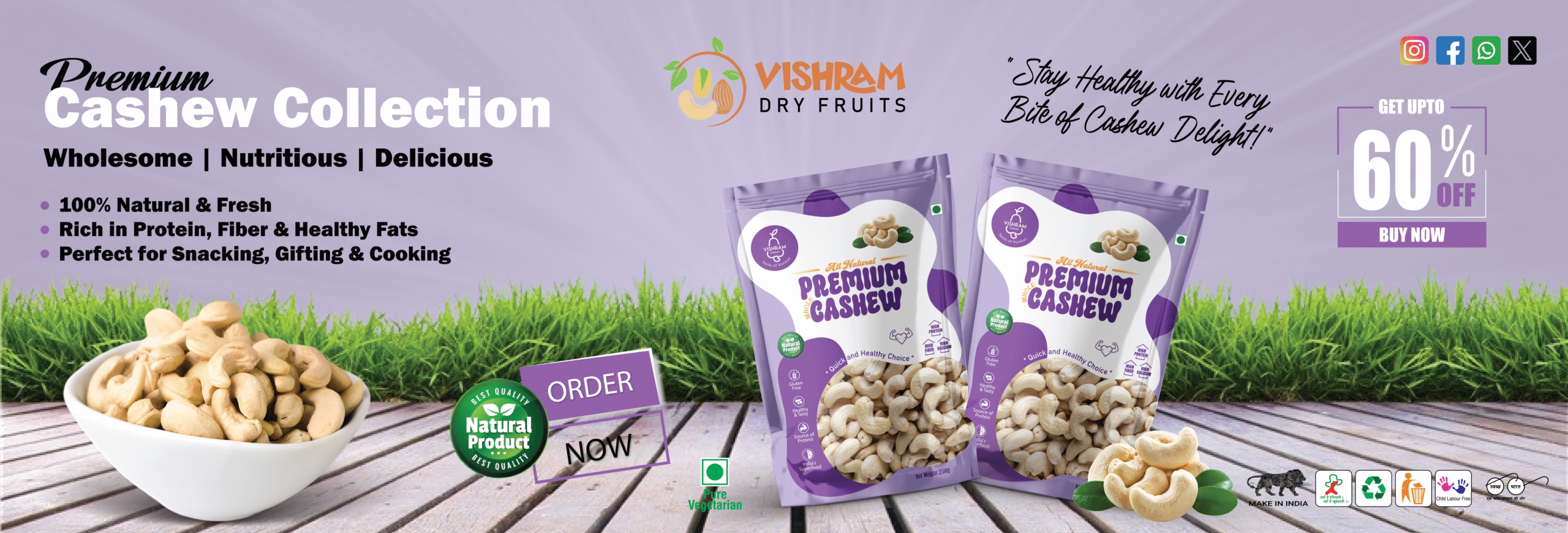At Vishram Cashew, quality is not just a standard — it’s our identity. From sourcing the finest cashew kernels to hygienic processing and elegant packaging Farm-to-Pack Freshness, International-Grade Processing Standards, Zero Compromise on Taste & Purity